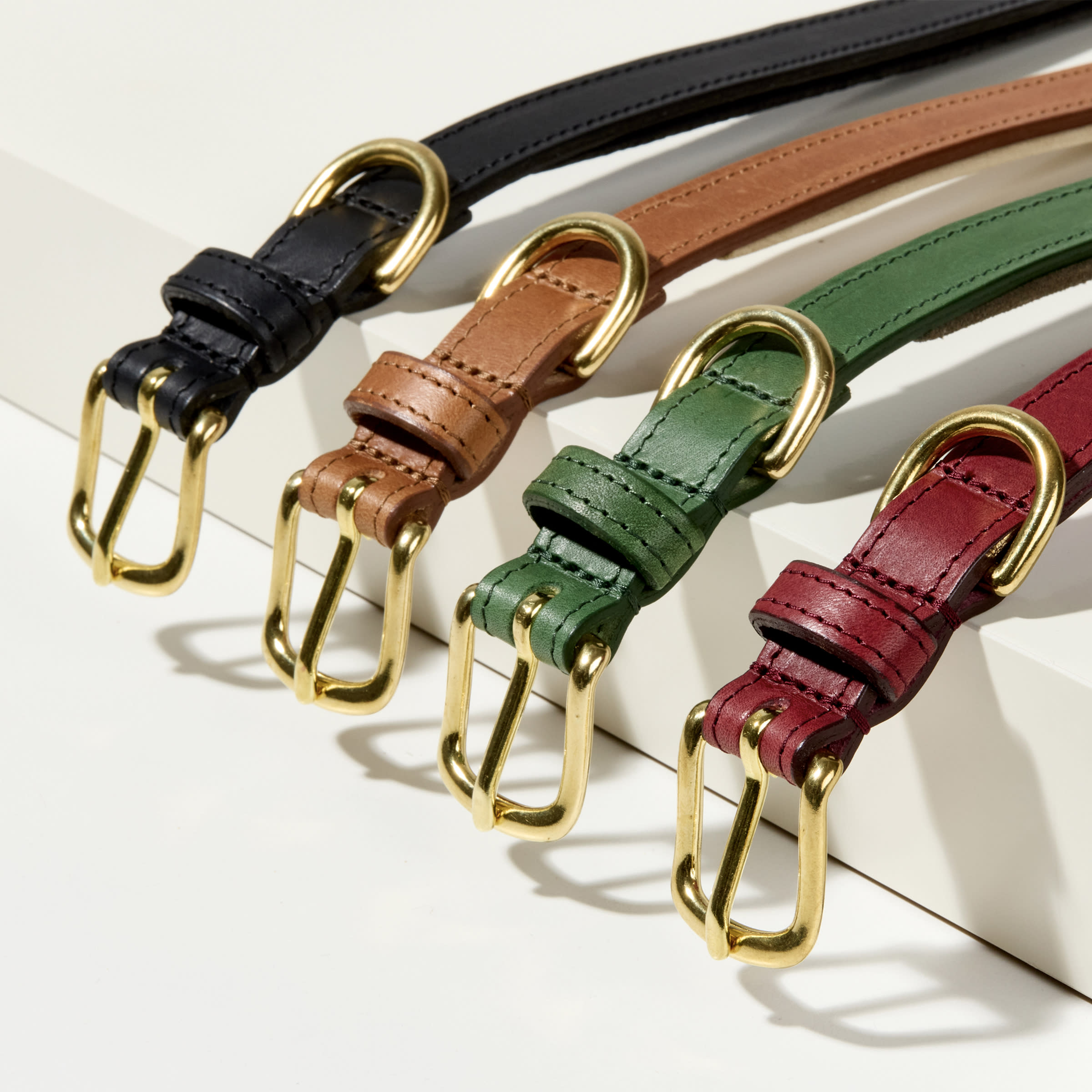 Handmade Italian leather dog collar, featuring a classic 'west end' solid brass buckle, and an engravable solid brass name tag. The inside is lined with a soft layer of suede for additional comfort.